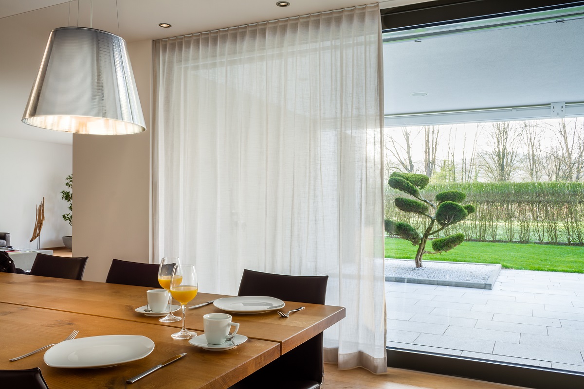 Unser LINIA ist im Vergleich zu LINUM etwas schwerer und blickdichter. Trotzdem sieht man bei Tag noch gut nach Draussen. Ein Blick nach innen ist bei Tag nur schwer möglich.